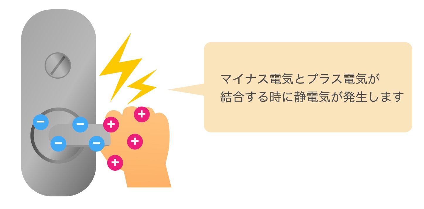 我々の日常では自然界と異なり高度な絶縁性を持つ絶縁物に囲まれています。電気を通すはずの人間が電気を流せない環境に置かれているのです。靴を履いたり、椅子に座ったり、衣服を着替えたり、自動車の運転をしたり、徐々に帯電してしまうのです。 そして、溜まった電気はいつでも流れやすい相手を探しています。そして、ドアノブなど金属部に近づくとバッチと一気に雷のような放電が発生するのです。