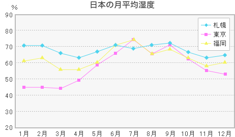 下のグラフは日本での湿度の変化を表しています。特に関東以北での湿度は