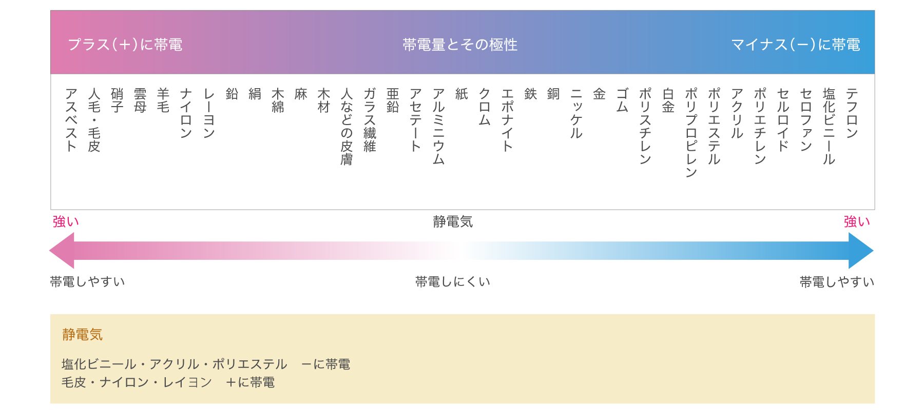 通常、様々な物質は+-(正負)の電位をほぼ同量もっていてバランスを保っていますが、 物質同士が触れ合い摩擦が起きることで物体は+-どちらかの電位かを多くもった偏った状態になります。これを帯電といいます。